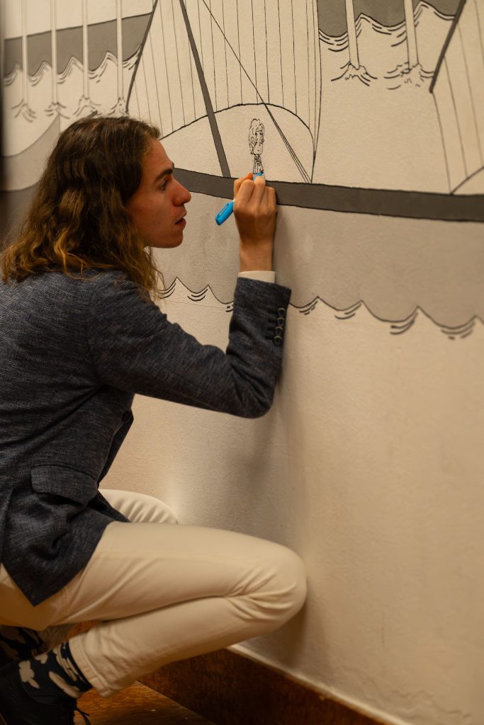 Quella di Nicolò è un’opera partecipativa che invita coloro che visitano il PoliCaffè a non essere spettatori passivi ma attivi. L’opera chiede di essere aggiornata costantemente grazie all’inserimento, ognuno nel proprio stile, dei ritratti delle persone che questo luogo lo frequentano e animano. Un segno del loro passaggio, d’ora in avanti, per sempre registrato qui a Dolcè.